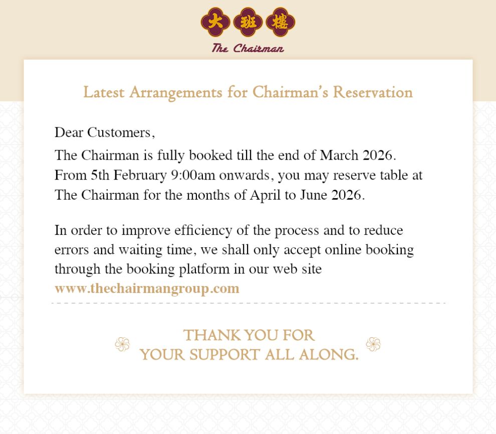 The Chairman Restaurant is fully booked until the end of March 2026. Any table cancellations will be automatically updated and displayed on this page.